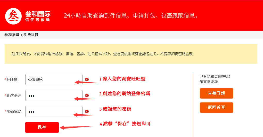 請注意:一定要使用你的淘寶登錄名註冊,方便認領您的貨物