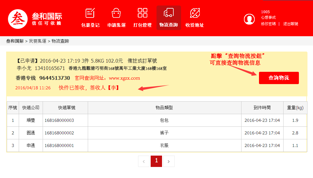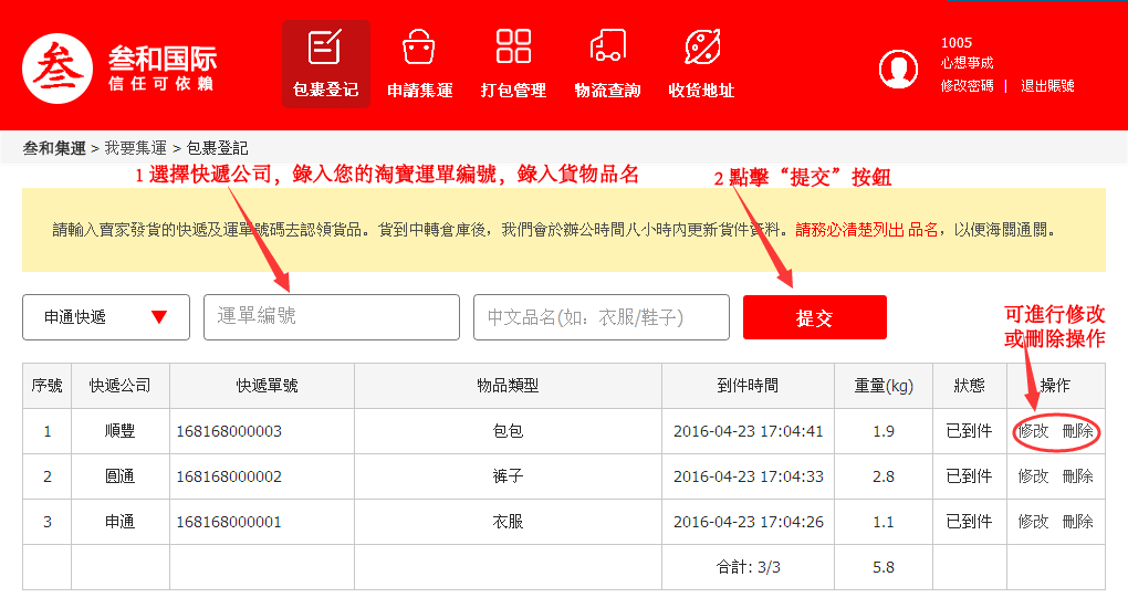 第三步:貨物登記,登入後, 將您已買到貨品的快遞公司及快遞單號輸入並提交.賣家發貨后即會有快遞運單號,請第一時間認領,這樣我們簽收貨物后即會顯示已入倉