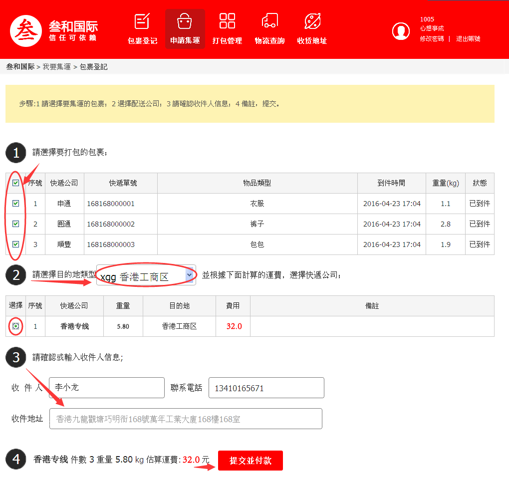 第四步:申請集運後,淘寶付款!錄入付款訂單號,並點提交即可!